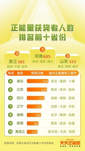 中新河南網(wǎng)1月12日電 (葛高遠 趙民強)一方水土養(yǎng)一方人,在我們身邊,從不缺乏真善美的身影。1月12日,《阿里公益“天天正能量”項目十年評估報告》發(fā)布,報告顯示,十年來阿里巴巴投入一個億,弘揚凡人善舉,喚醒世道人心,目前已在全國獎勵11570人,其中河南、浙江、山東等省份獲獎人數(shù)最多。