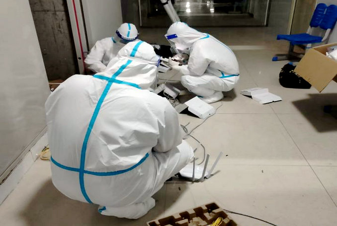 第二天早上7點(diǎn),忙碌一夜的隊(duì)員們來不及休息,匆匆將一身移動(dòng)通信藍(lán)換成嶄新的防疫白,扛起施工物資,義無反顧進(jìn)入隔離點(diǎn),熟練地進(jìn)行著線路跳纖、設(shè)備安裝等工序,為暫時(shí)滯留在隔離點(diǎn)的人員建設(shè)覆蓋全樓的無線寬帶網(wǎng)絡(luò)。