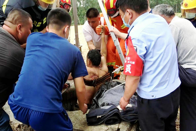 由于井口過于窄小,加上被困村民的特殊情況,歷經(jīng)一個(gè)小時(shí)的緊張救援,眾人合力將被困村民成功救出。
