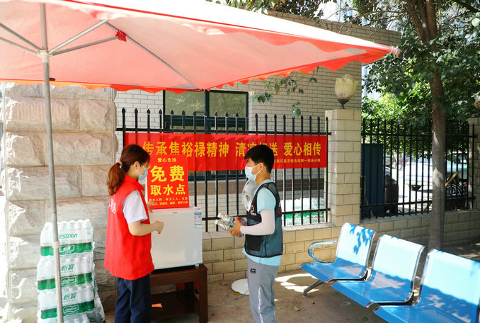 活動(dòng)中,分局組織干部職工自發(fā)籌集愛心款項(xiàng)用于買清涼物資,在北門西側(cè)為奮戰(zhàn)在高溫一線的環(huán)衛(wèi)工人、外賣配送者、快遞員等免費(fèi)提供降溫茶水、清涼物品,并開通“愛心驛站”,提供休息座椅、遮陽傘等;同時(shí)和環(huán)衛(wèi)工人、外賣配送人員等開展交流,了解他們?nèi)粘9ぷ鞯膬?nèi)容與辛苦。