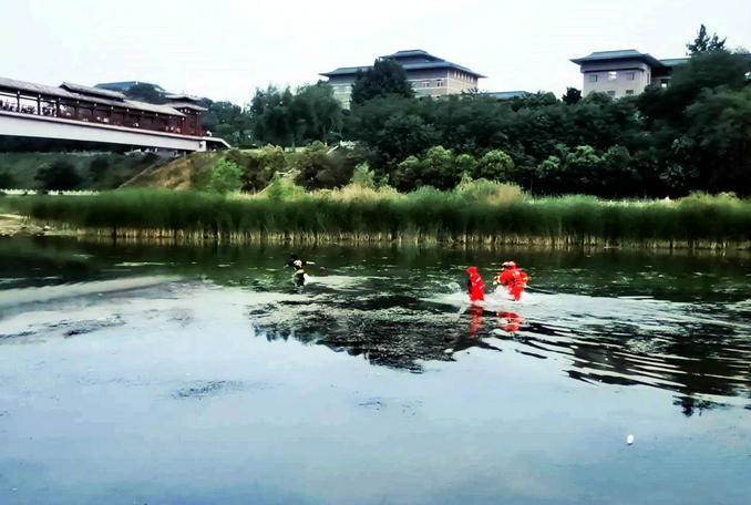 到達(dá)現(xiàn)場(chǎng)后,救援人員發(fā)現(xiàn),一名十幾歲的女孩站在潁河中,水面已淹沒至大腿處,情緒十分激動(dòng)。在做好安全防護(hù)的前提下,現(xiàn)場(chǎng)指揮員立即安排兩名水性較好的消防員攜帶救生器材下河救人,其他保障人員負(fù)責(zé)繩索保護(hù),協(xié)助救援。