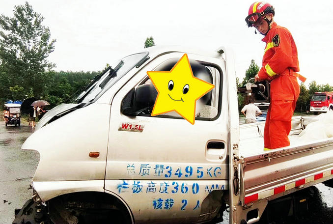 到達現(xiàn)場后,救援人員發(fā)現(xiàn)一輛小型貨車與另一輛大貨車相撞,小貨車受損嚴重,車頭已變形,車門無法打開,導致頭部受傷的駕駛員被困駕駛室。
