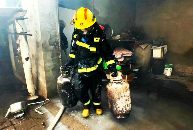 河南長葛:居民家中廚房失火情況緊急 消防員徒手拎出六個(gè)煤氣罐