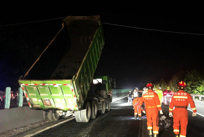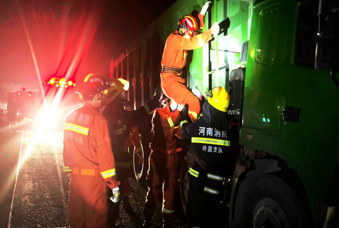 河南禹州:高速公路工程車(chē)誤觸高壓線 消防隊(duì)員立即趕赴排除險(xiǎn)情