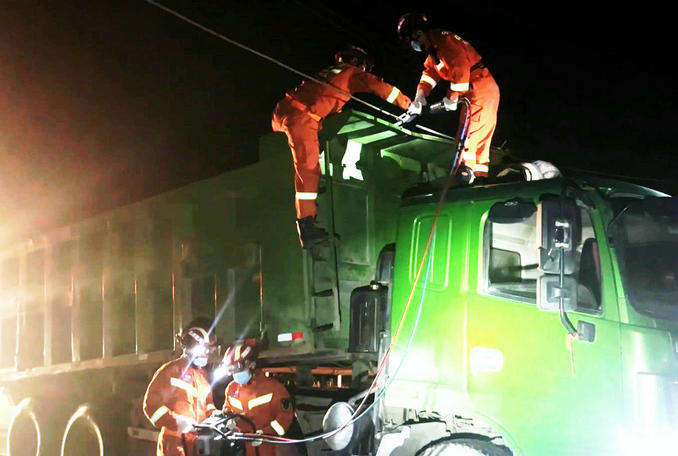 獲悉情況后,現(xiàn)場(chǎng)指揮員立即下令,救援人員聯(lián)合施工部門(mén)將貨車(chē)車(chē)廂降落到安全高度,再由救援人員攜帶機(jī)動(dòng)液壓剪短鉗等裝備前往車(chē)頂處進(jìn)行剪斷作業(yè)。
