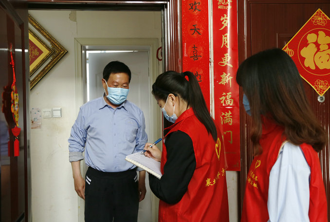 “叔叔,您好,請問您家里有沒有從上;蛘咂渌咔橹懈唢L(fēng)險地區(qū)返鄉(xiāng)的人員?如果有,請如實告知,并將信息進(jìn)行登記。”干警志愿者敲門入戶,逐戶排查,對家屬院居民有無疫情中高風(fēng)險地區(qū)返鄉(xiāng)的人員信息進(jìn)行排查登記。