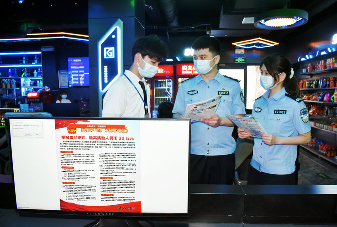 中新河南網(wǎng)6月14日電(張培 曹秀軍)為進(jìn)一步增強(qiáng)廣大人民群眾的禁毒意識,普及毒品知識、傳播禁毒理念、宣傳禁毒政策、震懾毒品犯罪,在6·26國際禁毒日來臨之際,許昌市公安局魏都分局禁毒大隊聯(lián)合網(wǎng)安大隊進(jìn)行禁毒“六進(jìn)”宣傳活動,以市區(qū)網(wǎng)吧為宣傳陣地,在網(wǎng)吧內(nèi)所有電腦登錄頁面顯示《河南省舉報毒品違法犯罪獎勵辦法》,讓每一位網(wǎng)吧上網(wǎng)人員都能看到宣傳界面,大力擴(kuò)展禁毒宣傳的傳播渠道,有效提升群眾對獎勵辦法的知曉率。