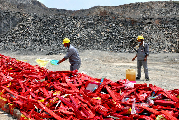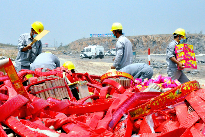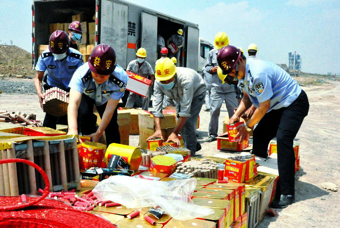 在禹州市公安局治安大隊(duì)和淺井派出所的配合下,將煙花爆竹運(yùn)至禹州市淺井鎮(zhèn)某廢棄石料廠,歷時(shí)五個(gè)半小時(shí),采用燃燒法安全銷毀。