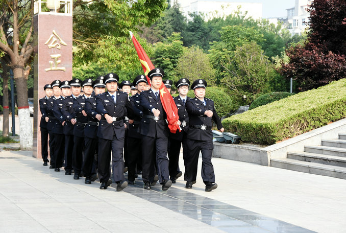在藍(lán)天和朝陽(yáng)的映襯下,伴隨著激昂的《義勇軍進(jìn)行曲》,鮮艷的五星紅旗冉冉升起,全體干警滿懷敬意地行注目禮。