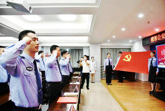 “我志愿加入中國共產黨……”面對黨旗,全體參會民警莊嚴地舉起右拳,集體重溫入黨誓詞。