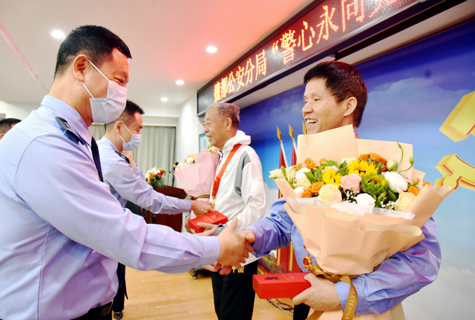 在熱烈的掌聲中,受到表彰的民警輔警上臺接受頒獎。