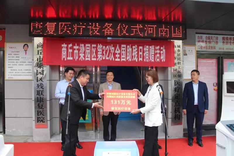 捐贈方代表河南省國健醫(yī)療有限公司總經(jīng)理耿書強和受贈方代表梁園區(qū)殘聯(lián)黨組書記、理事長李玉蓮進行了醫(yī)療設(shè)備交接。
