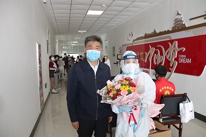 “感謝您為我們師生志愿服務(wù)!在新婚燕爾期間,您就志愿投入核酸檢測采樣工作,為我們?nèi)熒鷺淞⒘税駱。您的志愿精神值得我們學(xué)習(xí)!”商丘師范學(xué)院黨委書記司林勝在參加核酸檢測時(shí),得知郭可鑫事跡后,為她送上鮮花,并表示感謝。