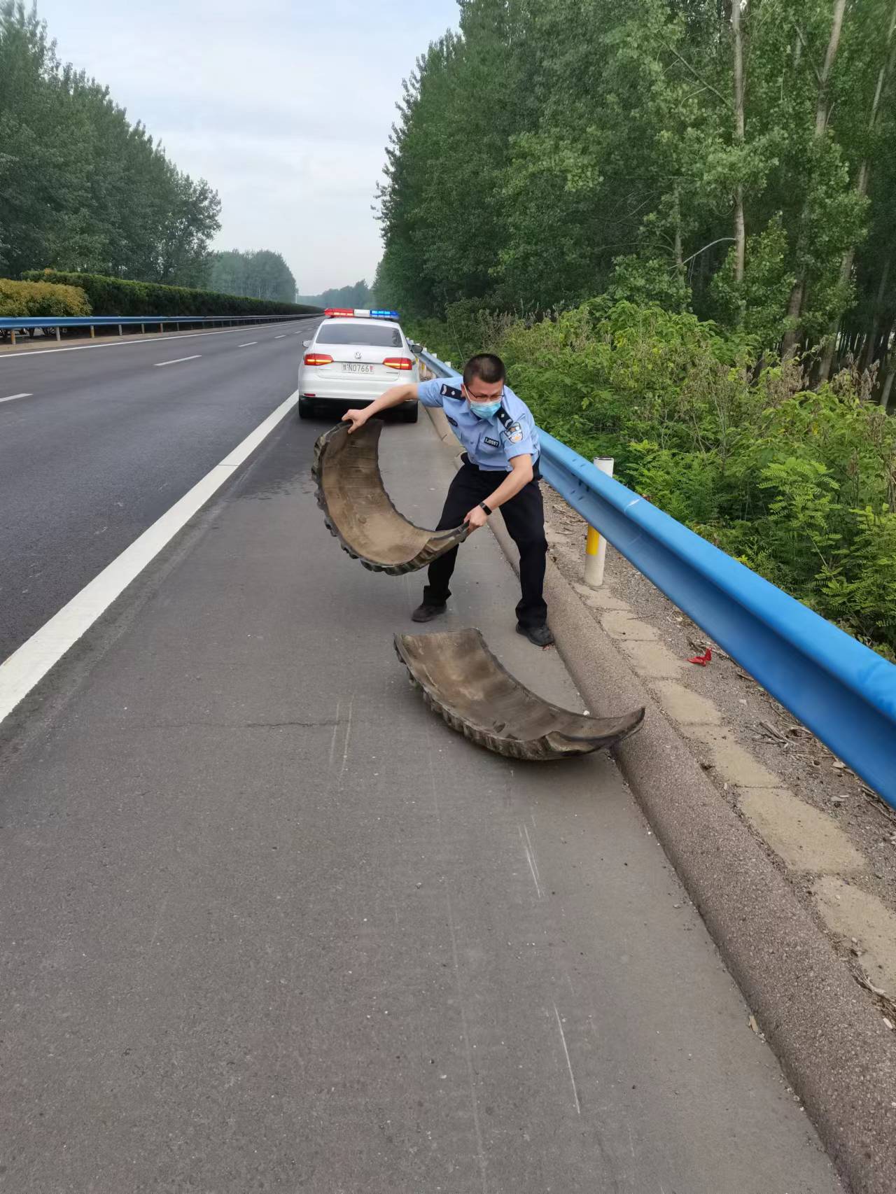 5月19日上午7時40分左右,商丘市公安局交警支隊高速大隊八中隊民警王浩楠帶領(lǐng)中隊人員張碩巡邏至鹽洛高速高速462公里北半幅時,遠(yuǎn)遠(yuǎn)看到前方不遠(yuǎn)處超車道行車道上散落幾個長達(dá)2米的大型輪胎皮,對過往車輛構(gòu)成極大威脅,嚴(yán)重妨礙了車輛的通行安全,使得途經(jīng)車輛紛紛急剎車避讓,非常危險。