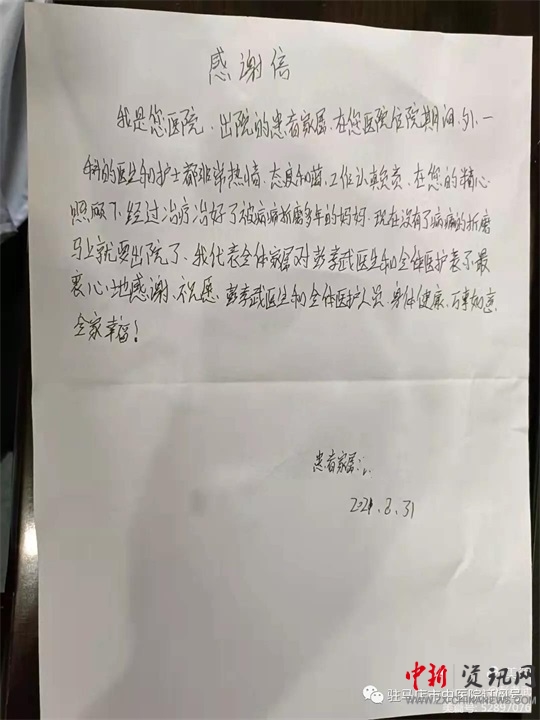 中新河南網(wǎng)駐馬店9月13日電(通訊員 李亞 姚娜)“感謝你們,用精湛的醫(yī)術(shù)、精心的護(hù)理,治好了被病痛折磨多年的媽媽,使她重新獲得了新生。”近日,在心胸大血管外科出院患者家屬感激地給心胸大血管外科醫(yī)護(hù)人員們鞠了一躬,并親手送上感謝信,以表達(dá)感激之情。