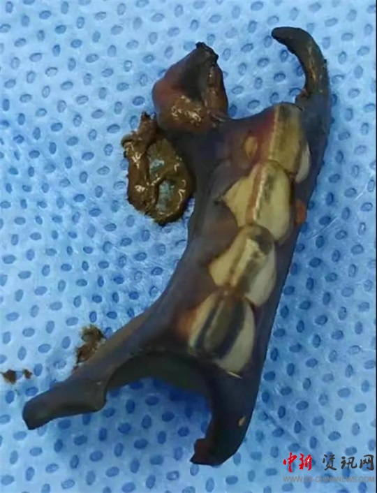 當(dāng)晚9點40分,廖新偉積極協(xié)調(diào),麻醉科手術(shù)部及輸血科密切配合,以劉大勇主刀、副主任醫(yī)師汪麗偉輔助,緊急為侯老太太施行了手術(shù)。打開腹腔,驚人地發(fā)現(xiàn)侯老太太腹腔已被糞便填滿,腸子漲的像氣球那么大。術(shù)中,經(jīng)過沖洗并且減壓腸道后,醫(yī)護團隊在直腸上段發(fā)現(xiàn)一大小約1.5cm破口,一堅硬物嵌頓在破口處,打開腸壁,一排帶鉤的假牙映入眼前。醫(yī)護人員將假牙小心翼翼地完整取出,足足有4cm長。由于侯老太太腹腔污染嚴(yán)重,且腸梗阻時間較長,腸壁水腫十分嚴(yán)重,無法再次重建消化道,于是胃腸外科團隊給老太太做了直腸遠端封閉+乙狀結(jié)腸造口術(shù)?紤]到患者腹腔污染術(shù)后可能出現(xiàn)感染腹腔膿腫等情況,醫(yī)護團隊給侯老太太左右上下總共放了5根引流管。