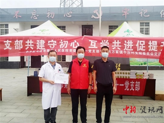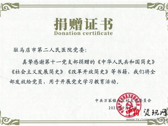 駐馬店市第二人民醫(yī)院第十一黨支部向平輿縣萬冢鎮(zhèn)牛莊村支部捐贈《新中國史》《改革開放史》《社會主義發(fā)展史》等黨史學(xué)習(xí)資料。