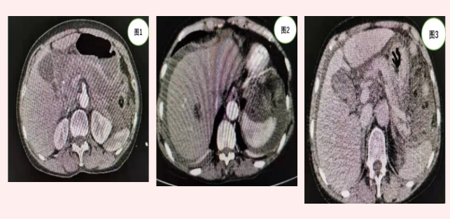 患者張某入院時,急診行全腹CT(見圖1)等相關(guān)檢查發(fā)現(xiàn)上腹部包塊但未見明顯肝脾破裂及腹腔積液。由于患者外傷,病情隨時可能加重,主管醫(yī)師張浩杰嚴密觀察病情時,患者腹痛加重,血紅蛋白進行性下降,立即復(fù)查上腹部增強CT(見圖2、3)發(fā)現(xiàn)腹腔大量積液。