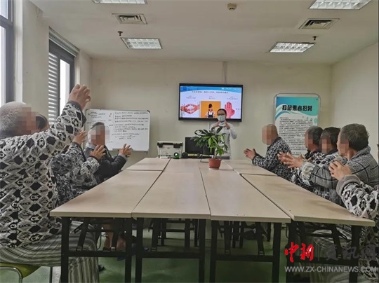 瞧,在男病區(qū),護(hù)士在為老年患者進(jìn)行健康宣教,帶領(lǐng)他們做預(yù)防癡呆手指保健操。