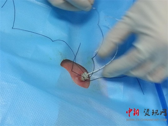 經(jīng)過(guò)病情研判,在征得患兒家長(zhǎng)同意后,新生兒科副主任陳春笑當(dāng)即囑咐手術(shù)醫(yī)生在患兒臍帶末端預(yù)留5cm左右殘端,以便臍靜脈置管。新生兒科主任劉冬麗現(xiàn)場(chǎng)指導(dǎo)并參與置管,建立無(wú)菌面、處理臍帶,暴露臍靜脈、小心翼翼插管,經(jīng)過(guò)兩位主任和護(hù)師周雨陽(yáng)的共同努力,最終導(dǎo)管順利置入。當(dāng)看到像繡花針一樣細(xì)的導(dǎo)管進(jìn)入預(yù)期位置,回抽見(jiàn)血那一瞬間,全體醫(yī)護(hù)人員的喜悅無(wú)以言表。