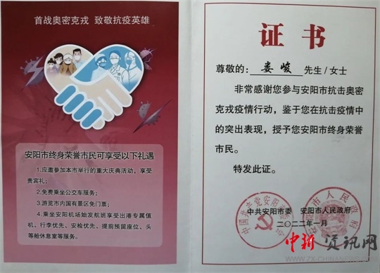鑒于婁峻在疫情防控工作中的突出表現(xiàn),中共安陽市委、市政府決定授予婁峻“安陽市終身榮譽(yù)市民”稱號。