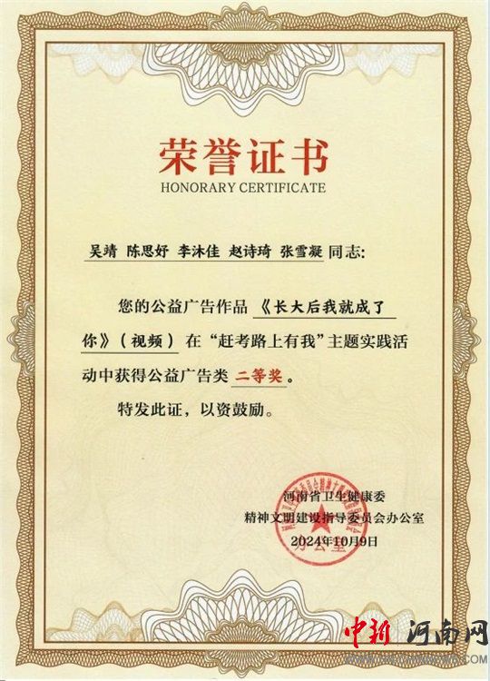 吳靖、陳思妤、李沐佳、趙詩琦、張雪凝共同創(chuàng)作的公益廣告《長大后我就成了你》榮獲公益廣告類二等獎;