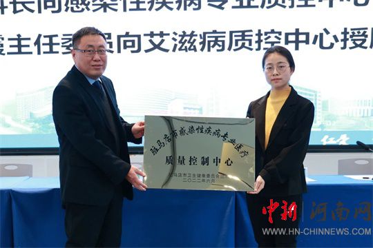丁鑫為駐馬店市感染性疾病專業(yè)醫(yī)療質(zhì)量控制中心授牌。