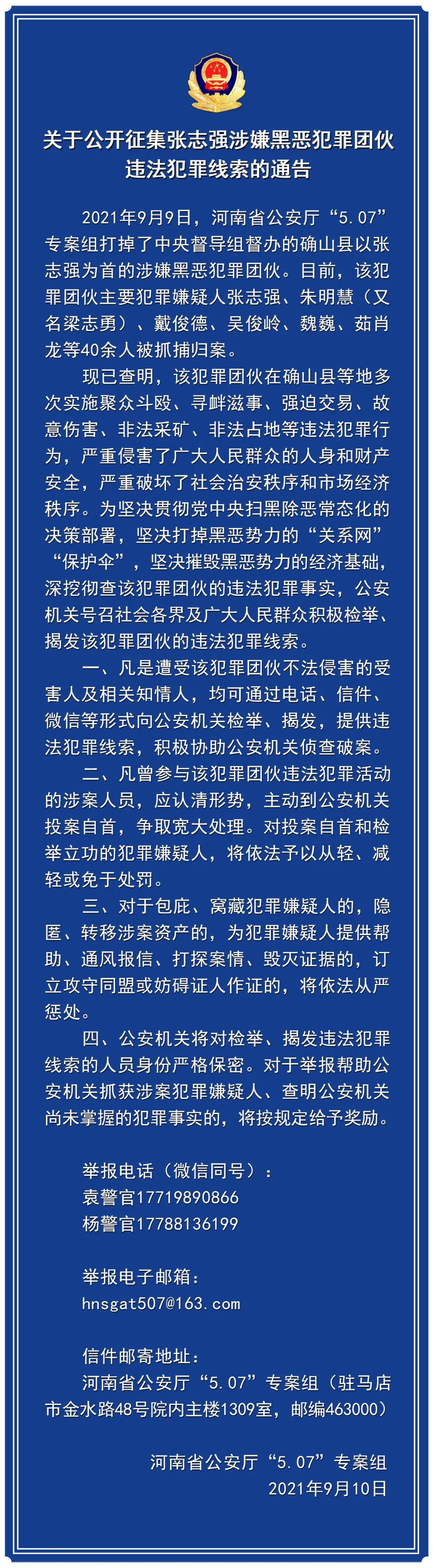 關(guān)于公開征集張志強涉嫌黑惡犯罪團伙違法犯罪線索的通告