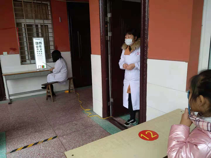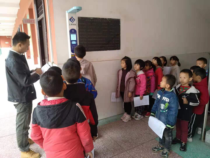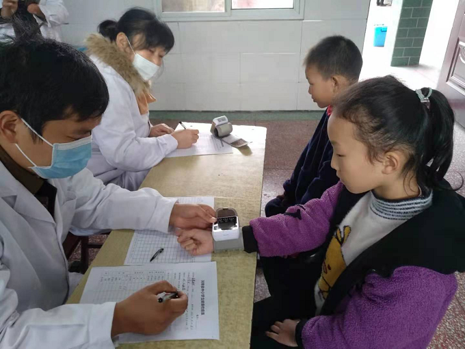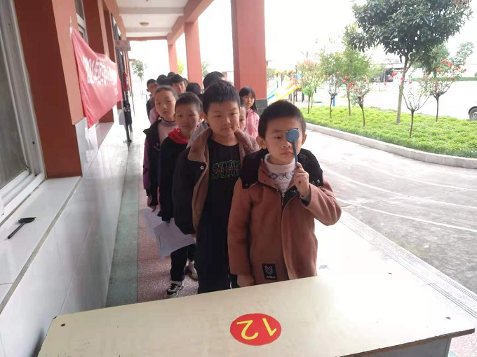 上午9點多,醫(yī)療隊來到王營小學(xué),校長王強(qiáng)上前熱情迎接。醫(yī)生們剛剛到達(dá),馬上從車搬下各種檢測儀器,在教學(xué)樓一樓走廊指定場地展開,接通電源,調(diào)試儀器,進(jìn)行事前準(zhǔn)備工作。從一年級到六年級包括大班和小班,各班學(xué)生在班主任帶領(lǐng)下,每人手持一張體檢情況登記表,依次排隊來到各個檢查口前,逐一分項進(jìn)行檢查。