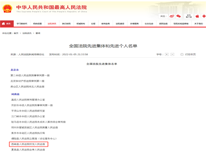 雙龍法庭榮獲“全國法院先進(jìn)集體”稱號
