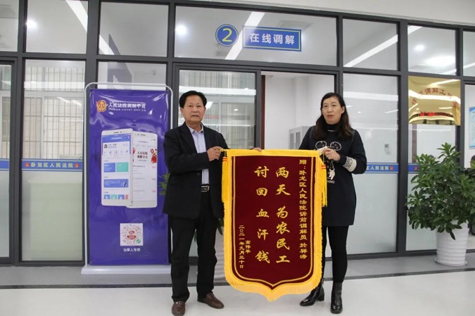中新河南網10月14日電(李克選 丁清凌 常照軍) “謝謝,真的是太感謝你了,要不是你,真不知道這些錢啥時候才能要回來。”10月9日上午,高某將一面寫著“兩天為農民工討回血汗錢”的錦旗送到南陽市臥龍區(qū)人民法院訴前調解室訴前調解員於祥濤手中,對該院人民調解員盡心盡力、高效調解的工作態(tài)度點贊。