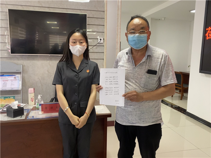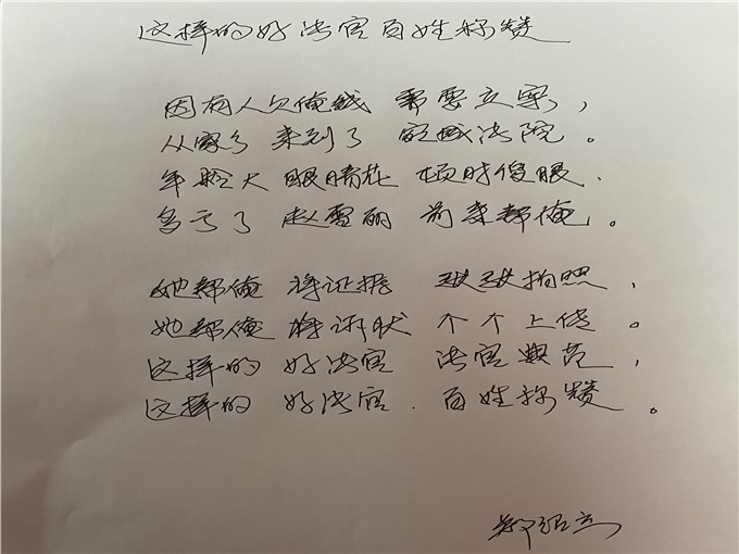 導(dǎo)訴員在了解情況后,首先安撫了老人情緒,接著對(duì)老人提出的問題逐一耐心解答還幫助他整理證據(jù)、訴狀通過立案小程序快速成功立案。導(dǎo)訴員熱心、耐心、周到的服務(wù),讓老人備受感動(dòng),他當(dāng)即拿出筆和紙寫下了一首打油詩表達(dá)謝意。其實(shí)這樣的事情對(duì)于導(dǎo)訴員來說,只不過是一件微不足道的小事和自己的職責(zé)所在。但對(duì)于不懂流程、“智能尷尬”老人來說,卻讓他們感受到了司法的溫度和速度。