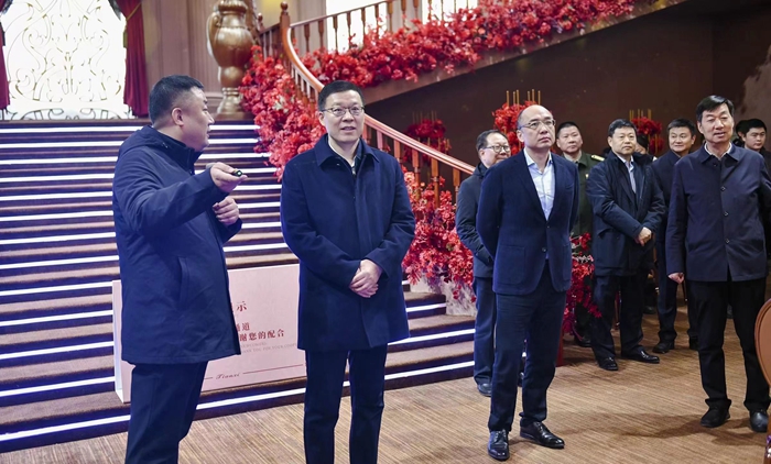 中新河南網(wǎng)12月6日電(任錢坤) 全息光影宴會廳更換場景只需一鍵切換,就能打造出不同場景,簡單的軟裝搭配光影效果,立刻呈現(xiàn)出風(fēng)格迥異的視覺畫面。11月30日下午,在河南省漯河市源匯區(qū)天禧宴會藝術(shù)中心,由漯河市委書記秦保強(qiáng)帶隊(duì)開展的重點(diǎn)項(xiàng)目觀摩活動現(xiàn)場,隨著燈光閃爍實(shí)現(xiàn)一廳多變,多種色系的婚禮宴會廳通過不同燈光渲染切換出各種場景,讓觀摩人員沉浸式體驗(yàn)到了夢幻魅力。