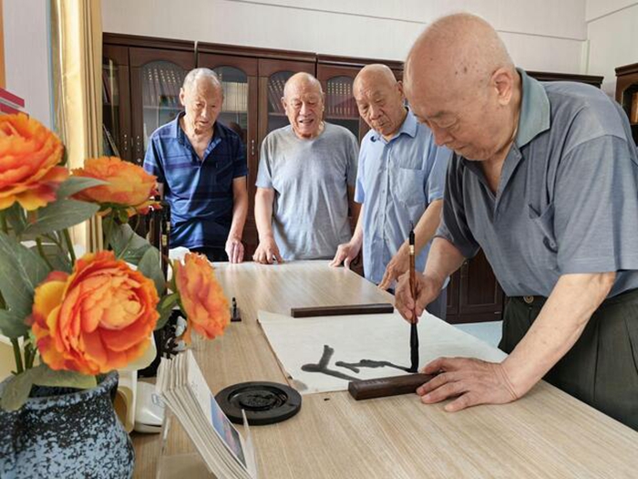 在書(shū)畫(huà)室,88歲的徐玉忠老人正在練習(xí)書(shū)法,還有幾位老人圍觀徐玉忠老人寫(xiě)字。