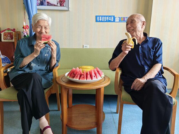 “雖然外面很熱,可是這里很涼快。”90歲的寧春喜和86歲的老伴黃玉枝在房間一邊吃西瓜,一邊看電視。