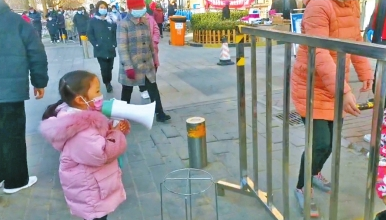 記者看到趙怡茹小朋友拿著小喇叭對來做核酸檢測的人員喊道:“保持一米距離,戴好口罩,提前亮碼。”據(jù)孩子?jì)寢尭镀G萍說:“主要是我要來當(dāng)志愿者,家里沒人,就帶她一起來了,正好可以鍛煉鍛煉她。”