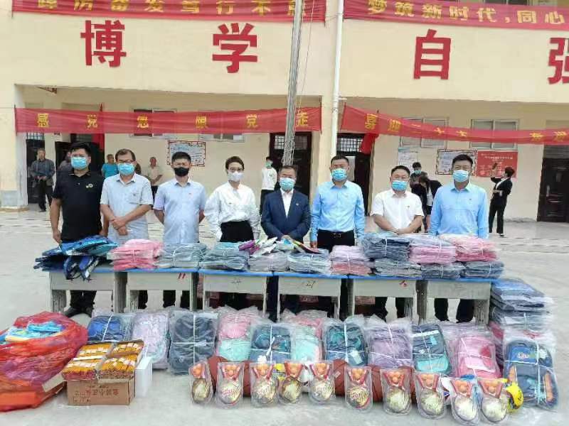 新聯(lián)會(huì)代表們來(lái)到虞城縣聞集鄉(xiāng)八里井小學(xué),將書(shū)包、文具盒、鉛筆、籃球、排球、足球、羽毛球拍、乒乓球拍、跳繩、國(guó)旗等文體用品送到全體師生手中。