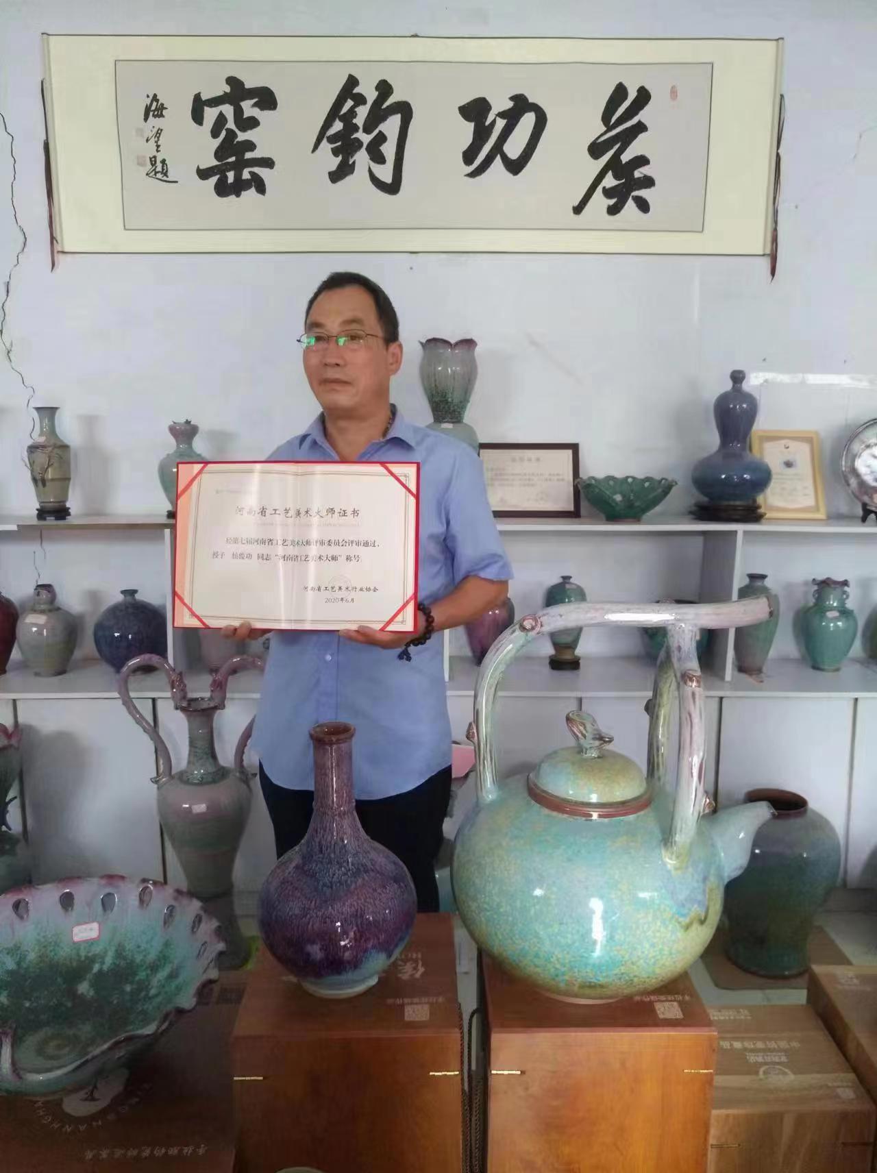 1986年侯俊功在神垕瓷高畢業(yè)后,拜鈞瓷藝術(shù)名家蔡大水、劉國安老師專心學(xué)習(xí)鈞瓷制作工藝。2013年創(chuàng)辦了自己的工作室,建起了液化氣燒窯爐、煤(柴)燒窯爐和炭燒窯爐。