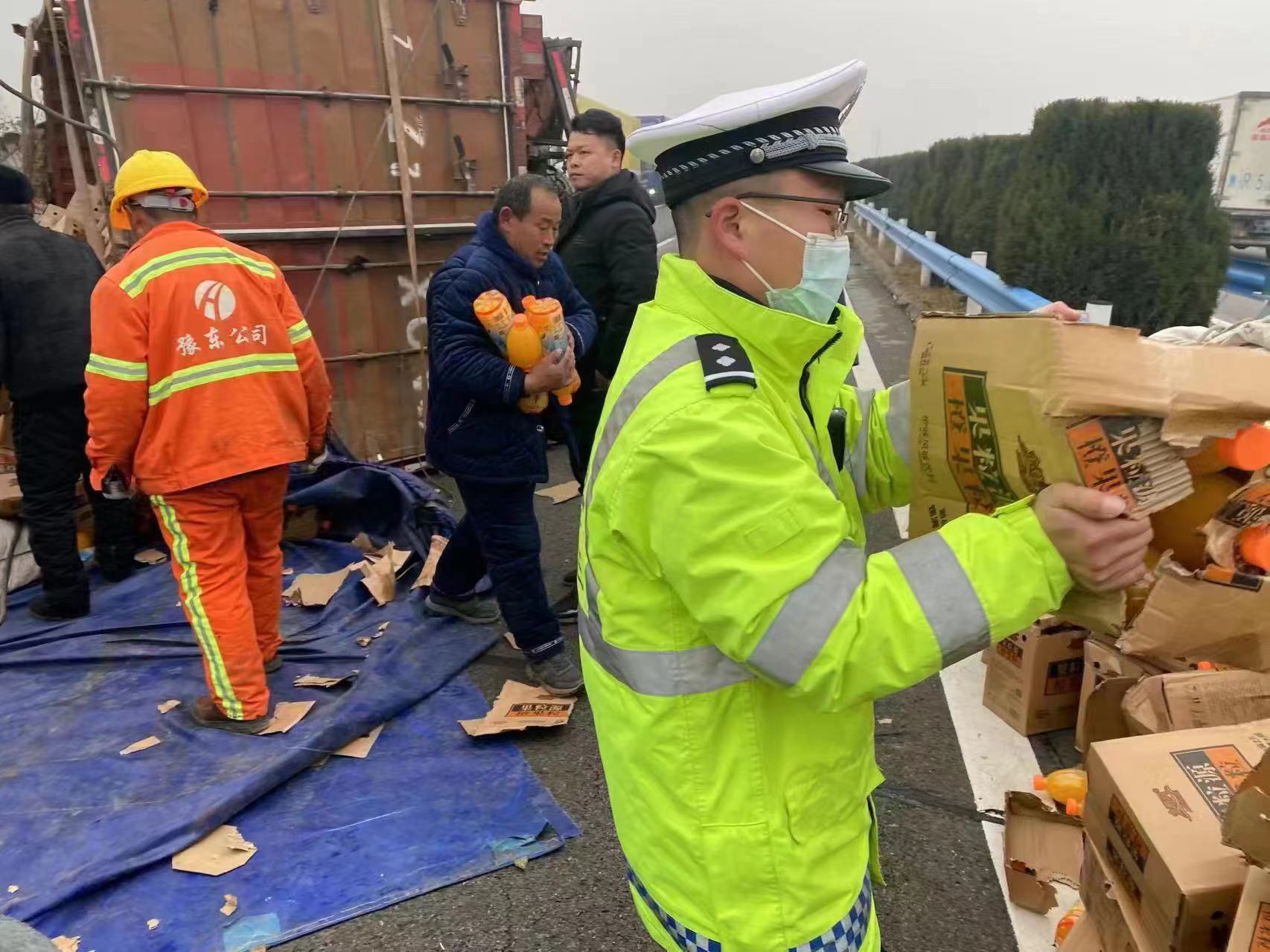 接警后,八中隊副中隊長王浩楠帶領(lǐng)中隊隊員火速趕赴現(xiàn)場,同時通知路政及救援車輛前來增援。民警到達現(xiàn)場后發(fā)現(xiàn),民警看到翻到在路面上,到處滾滿了飲料,如果不及時處置,存在著較大的交通隱患。此時,過往車流滾滾,飲料散落的到處都是,司機只要稍有不慎,極易發(fā)生二次事故。如何將這么多的飲料短時間內(nèi)收集轉(zhuǎn)運,減少車主的損失,快速恢復(fù)通行,迫在眉睫。民警當(dāng)即安排巡邏車輛在后方做好警戒,對現(xiàn)場進行處置,避免二次事故的發(fā)生。