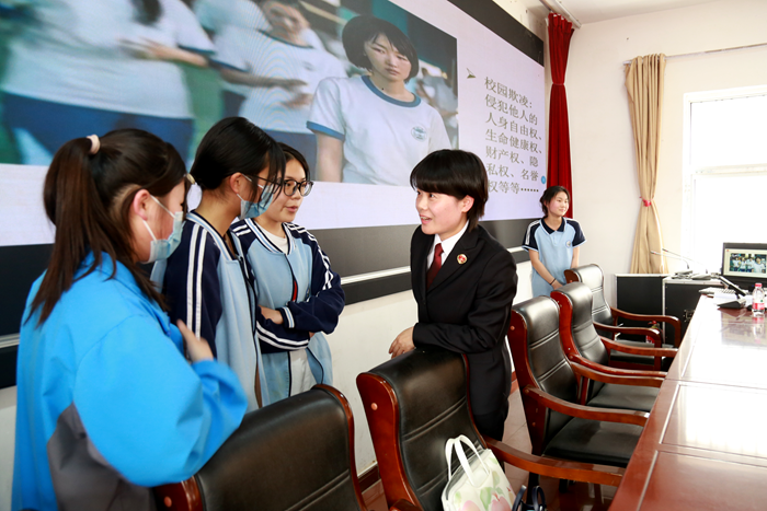 介紹完國家安全有關(guān)知識(shí),韓輝結(jié)合典型案例,向?qū)W生講解法律關(guān)于未成年人犯罪刑事責(zé)任年齡的規(guī)定,常見的未成年人犯罪罪名、犯罪原因及預(yù)防措施。重點(diǎn)講述了校園欺凌、危害及處置辦法,鼓勵(lì)學(xué)生勇敢、機(jī)智應(yīng)對,保護(hù)自己的合法權(quán)益等。講解過程中,為了加深同學(xué)們印象,她用虛擬案例故事《內(nèi)戰(zhàn):聚眾和斗毆》闡釋法律術(shù)語,讓學(xué)生扮演角色、情景模擬進(jìn)行情感體驗(yàn),一個(gè)多小時(shí)的講授高潮迭起。