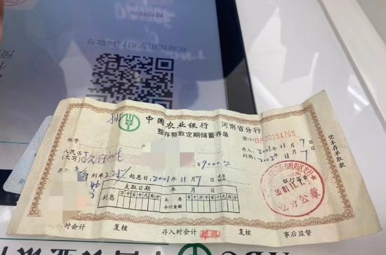 近日,該行一開門就迎來一位戴著草帽的老先生,網(wǎng)點(diǎn)大堂客服經(jīng)理馬欣熱情地接待了他,詢問老先生辦理什么業(yè)務(wù),老先生顫顫巍巍的從布袋里掏出一張陳舊微黃的紙張,接過來一看,是一張2001年手寫的定期儲蓄存單(正常支取需查閱歷史檔案資料,且身份證信息保持一致),于是趕緊把內(nèi)勤行長祁苗苗喊出來詢問怎么辦理。