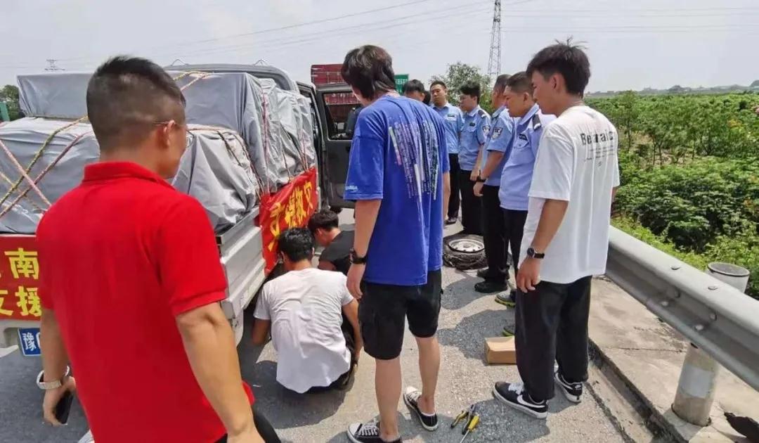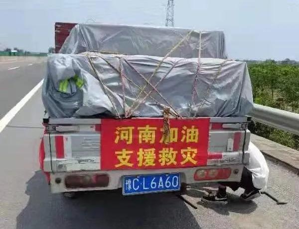 中新河南網(wǎng)7月27日電(王清平)2021年7月25日,輝縣市人民法院根據(jù)市委、市政府的工作安排,繼續(xù)執(zhí)行受災(zāi)群眾的安置轉(zhuǎn)移工作。在從獲嘉縣返回輝縣市的高速上,遇到一輛載滿支援河南物資的車停在半路,有人在路邊揮手求助。我院干警立即靠邊停車,待查看后,原來(lái)是車輪胎爆胎,備胎也沒(méi)氣了。了解這一情況后,武剛、段典均及另外三名干警將備胎帶下高速充氣,在返回高速送還并協(xié)助將輪胎安裝好后,目送他們安全離開(kāi)。