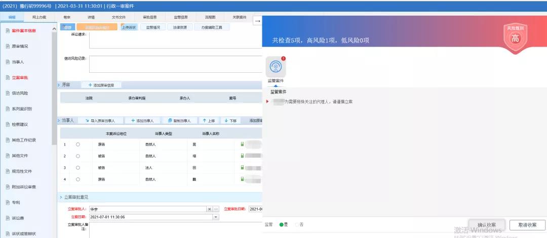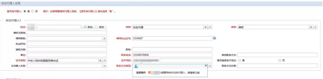 當(dāng)各級法院立案部門工作人員在錄入案件代理人、辯護(hù)人等基本信息時,系統(tǒng)會進(jìn)行立案風(fēng)險篩查,一旦發(fā)現(xiàn)案件代理人、辯護(hù)人為法院離職人員時,自動進(jìn)行信息比對,對違規(guī)代理本院案件或違反禁業(yè)限制規(guī)定代理案件的人員,直接進(jìn)行攔截操作;在案件辦理過程中,變更代理人、辯護(hù)人等基本信息時,系統(tǒng)會提醒法官該案件存在違規(guī)代理風(fēng)險,應(yīng)及時告知當(dāng)事人更換訴訟代理人或辯護(hù)人,強化法院離職人員從業(yè)限制期內(nèi)監(jiān)督管理。
