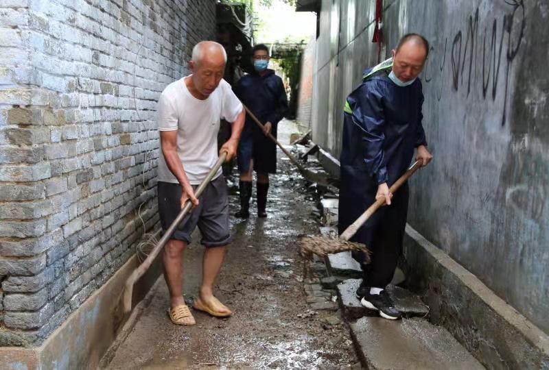 一把鐵鍬,一袋沙包,一個鐵盆……面對突發(fā)汛情,法院干警在王宏偉院長的指揮下,齊心協(xié)力,幫助受災群眾清除積水。