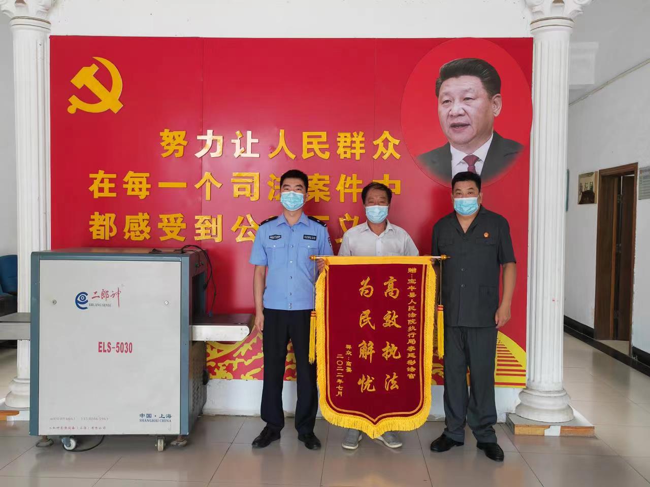 中新河南網(wǎng)7月28日電(解曉孛賈耀宗)近日,寶豐縣人民法院執(zhí)行局收到了一面寫著“高效執(zhí)法為民解憂”的錦旗,經(jīng)過了解,原來是申請執(zhí)行人高某向執(zhí)行局贈送的,言語之間高某對執(zhí)行局干警公正司法、一心為民的工作作風非常滿意,并對執(zhí)行干警李延彬同志再三表示感謝。