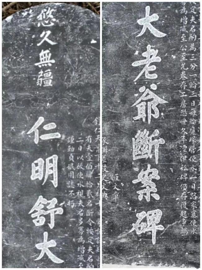 碑文分左中右三個部分,上下書寫、自右向左排列,中間字體較大:“悠久無疆仁明舒大老爺斷案碑”;右邊是主文,列明當事人、案由及判決結果:“汝旁舊有重修渠一道魔塚營路家寨兩村居民均食其利輪流灌溉毫無爭執(zhí)同治甲戌路家寨霸水偏澆七月間復又私捏碑文因控舒仁天案下十二月初十日蒙訊詰知此渠共夫貳伯零玖名魔塚營現(xiàn)有夫陸拾柒名路家寨現(xiàn)有夫壹伯肆拾貳名斷令按定夫名酌為三分一輪三日每輪魔塚營使水一日路家寨使水二日以後使水視夫名多寡為增減至公至允卷存工房恐世久年湮伊私碑仍存復起爭端謹勒貞瑉用誌不朽”;左邊是尾部,列明辦案者和時間:“承辦差役姬文章史文典焦泮大清同治拾叁年歲次甲戌十二月穀旦”。