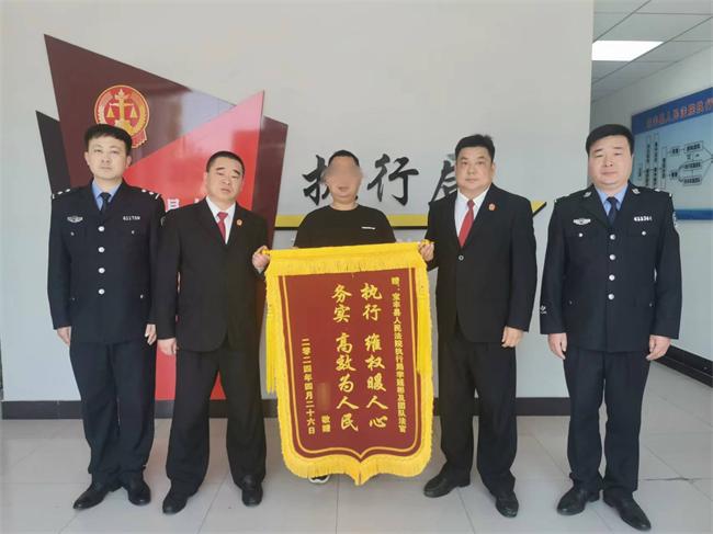 進(jìn)入執(zhí)行程序后,執(zhí)行干警認(rèn)真查閱卷宗、梳理案情,第一時(shí)間向被執(zhí)行人王某送達(dá)執(zhí)行通知書、報(bào)告財(cái)產(chǎn)令等法律文書,敦促其履行義務(wù)、報(bào)告財(cái)產(chǎn)。與此同時(shí),執(zhí)行干警通過“總對總”線上查控系統(tǒng)對王某名下的財(cái)產(chǎn)進(jìn)行查詢。據(jù)系統(tǒng)反饋,王某名下無任何可供執(zhí)行的財(cái)產(chǎn),并且李某也無法提供王某的行蹤及財(cái)產(chǎn)線索,案件一度陷入了僵局。“難度再大也要寸步不讓,標(biāo)的再小也要分毫必爭”。李延彬巧妙地研究對策、制定方案,帶領(lǐng)團(tuán)隊(duì)干警不厭其煩地于不同時(shí)段多次奔赴被執(zhí)行人王某可能去的落腳點(diǎn)實(shí)地調(diào)查。功夫不負(fù)有心人,在一次執(zhí)行行動(dòng)中,終于查找到王某的下落,面對如同神兵天降的執(zhí)行干警,滿臉錯(cuò)愕的王某終于明白如何處心積慮地東躲西藏也最終難逃正義的天羅地網(wǎng)。王某隨即被依法拘傳至寶豐法院,在執(zhí)行干警耐心地釋法明理及強(qiáng)大的執(zhí)行震懾下,王某當(dāng)場將數(shù)萬元案款全部履行完畢。收到案款后,申請人李某難掩激動(dòng)之情,“我本來對這筆錢都不報(bào)啥希望了,沒想到為我這點(diǎn)兒錢,讓咱寶豐法院執(zhí)行局的同志們跑了這么多趟,費(fèi)了這么多心,你們真是咱老百姓的貼心人、守護(hù)神”。第二天清晨,申請人李某早早地來到寶豐法院送錦旗,便有了開頭的一幕。