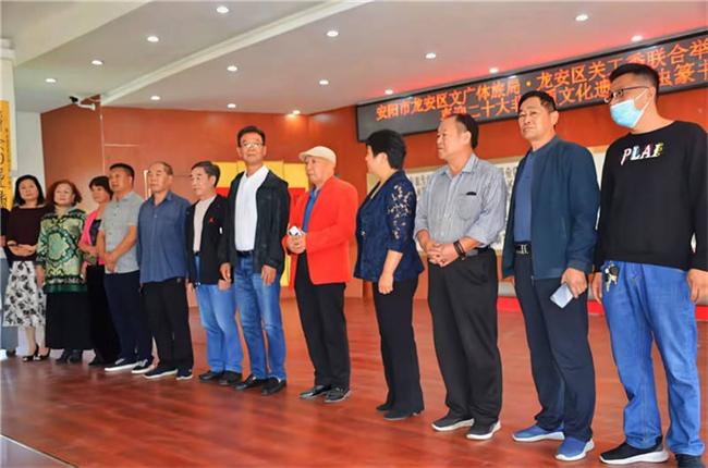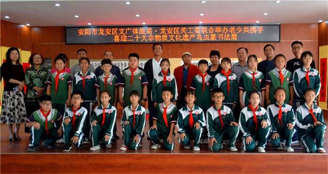 龍安區(qū)關(guān)心下一代工作委員會、龍安區(qū)文廣體旅游局、龍安區(qū)教育局領(lǐng)導(dǎo)、干部、員工出席并講話。部分學(xué)生參加開幕式,參觀了非物質(zhì)文化遺產(chǎn)鳥蟲篆書法作品展。安陽市五老退休干部和豫北書畫院書畫藝術(shù)家現(xiàn)場舉行了筆會交流。令參觀者和學(xué)生深受啟發(fā)和鼓舞。