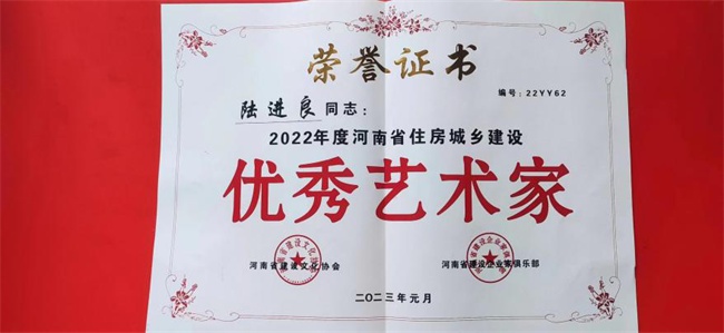 2023年2月3日,“雙擁劇場(chǎng)”燈光璀璨,河南省建設(shè)文化協(xié)會(huì)會(huì)長(zhǎng)黃海將“優(yōu)秀藝術(shù)家”榮譽(yù)證書(shū),頒發(fā)給陸進(jìn)良。與此同時(shí),當(dāng)天其他受到表彰的人員,也被邀請(qǐng)上臺(tái)并合影留念。