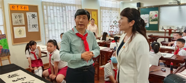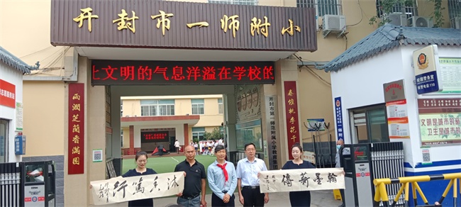 中新河南網(wǎng)(謝輝)漢字書法藝術(shù)是中華民族的瑰寶,行楷隸篆見功夫,墨香四溢校園香。開封市第一師范附屬小學為進一步推進素質(zhì)教育的全面實施,弘揚中華優(yōu)秀傳統(tǒng)文化,培養(yǎng)學生書寫能力,提高文化品質(zhì)和審美能力,引導學生對中華漢字的認同感,全力打造書香校園。2023年5月31日上午,一師附小開展以“書法傳承進校園,翰墨飄香盡芬芳”為主題的書法名家進校園活動。應邀開封市教育書法研究會會長史根之帶領開封大學工會辦公室主任毛成利、副秘書長賈風偉蒞臨我校參加此次活動。